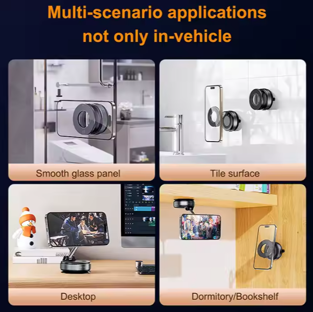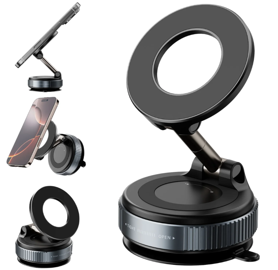 Descubre la solución definitiva: un soporte magnético con ventosa de vacío reforzada con bloqueo giratorio, que mantiene tu teléfono firme incluso en caminos irregulares. Sin adhesivos permanentes ni complicaciones.